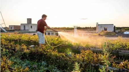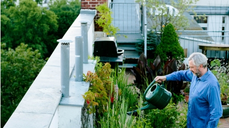 Pflanzen aufs Dach? Und ob! Denn das dämmt genial, schont das Klima, sieht gut aus und macht auch noch Spaß. So. Haus gebaut. Garten auch. Langsam wird es gemütlich in deinem neuen Zuhause. Vielleicht bist Du auch vor kurzem in Deine eigene Dachgeschosswohnung eingezogen. Und jetzt? Grüner wird`s nicht? Von wegen! Denn auf Deinem Dach ist viel Platz. Damit ist nicht nur das Hausdach gemeint, sondern zum Beispiel auch das der Garage oder des Gartenhauses. Also: Mach grün da oben, und zwar mit Deinem neuen Dachgarten. Den kannst Du auf vielfältige Weise anlegen. So gibt es zum Beispiel zwei Arten der Bepflanzung – die extensive und die intensive. Die extensive ist die gängige, ganz nach dem Motto „Mach mal halblang“. Denn es werden ausschließlich niedrig wachsende Pflanzen gesetzt, die nicht höher werden als 20 Zentimeter. Ihnen reicht eine dünne und damit leichte Substratschicht. Sie versorgen sich komplett selbst, können Hitze und Kälte ab. Du willst mehr? Dann ist die intensive Bepflanzung was für Dich – mit Sträuchern, Büschen und sogar Bäumen. Obacht: Dafür brauchst du in der Regel eine Baugenehmigung und solltest vorab mit Statiker und natürlich dem Dachdecker sprechen. Denn die größeren Pflanzen samt Boden wiegen in Summe natürlich einiges. Außerdem brauchst du eine Absturzsicherung. So oder so machst Du Dich am besten mal beim Bauamt schlau, auch zum Thema Fördermittel. Je besser geplant und umgesetzt, desto mehr kannst Du den neuen Dachgarten und die geniale Aussicht von oben genießen. Und wo Du schon mal oben bist: Wie wäre es mit Säen und Ernten beim Urban Farming? Zumal ein Nutzgarten auf dem Dach, der dir Obst und Gemüse schenkt, den Transportweg maximal verkürzt. Dein Dachgarten hat aber noch einen anderen, sehr wertvollen Effekt: die Klimatisierung. Er ist gut für die Artenvielfalt und damit ganz allgemein für Klima und Natur, aber auch ganz konkret für dein eigenes Zuhause. Denn er verhindert sowohl extreme Hitze- als auch Kältebildung. Unter einem rund 15 Zentimeter dicken Gründach wird es nicht wärmer als 25 Grad. Das ist halb so viel wie auf einem Kiesel-Flachdach. Im Winter wird genau umgekehrt ein Schuh draus, denn dann sinkt die Temperatur kaum unter den Gefrierpunkt. Als sehr praktisch erweist sich der Dachgarten auch bei Starkregen, denn den nimmt er auf. Wenn er das gespeicherte Wasser verdunstet, kühlt und befeuchtet er die Luft. All das senkt die Energiekosten. Und bei all dem schluckt er auch noch den Schall. So hat sich der Dachgarten heimlich, still und leise zum echten Hit entwickelt.